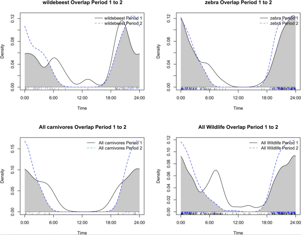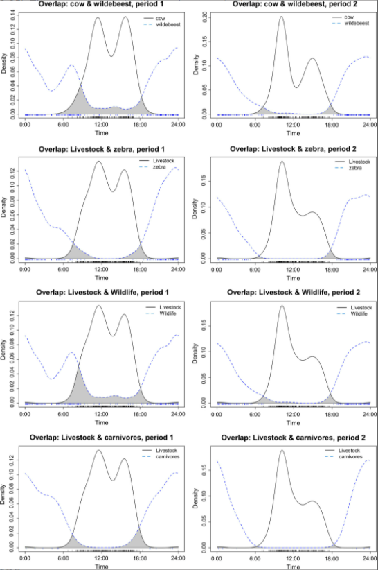 Abstract: African rangelands support substantial wildlife populations alongside pastoralists and livestock. Recent wildlife declines are often attributed to competition with livestock over water and grazing, in part because livestock are thought to spatially displace wildlife. However, more evidence is needed to understand this interaction and inform rangeland management. Here, we analysed the temporal overlap between wildlife and livestock at water points in a community-governed area of Kenya's South Rift Valley, which is a dry season refuge where Maasai pastoralists, livestock and wildlife co-occur. We used camera traps to capture images at water points in two time periods: first, when nearby settlements were unoccupied, and second, as people and their herds moved into the area. We measured wildlife activity (independent detections per hour) and the difference in temporal overlap between livestock and wildlife. We found no evidence that daily wildlife activity declined despite increased human and livestock settlement. However, temporal partitioning between livestock and wildlife at watering points increased with wildlife using water resources more at night. Maasai corral livestock overnight to protect them from predation, allowing wildlife to persist in a livestock-dominated landscape. Our study demonstrates humans and wildlife co-adapting to mitigate competition for shared water resources, thereby facilitating spatial coexistence.