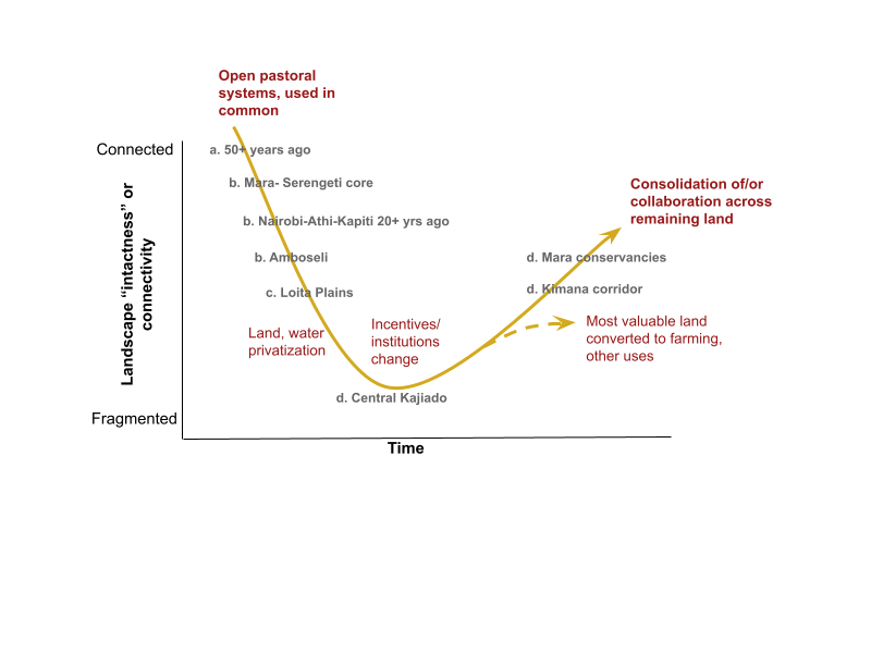 We found that much of this loss of space is the result of the privatization and sale of land, with property values in many areas far outweighing the economic returns from livestock and/or ecotourism. Most of this information is not new to conservation and rangeland NGOs. Projects are underway across the region to reverse or stabilize this trend with various tools from land-use planning, ecotourism, and carbon credits.