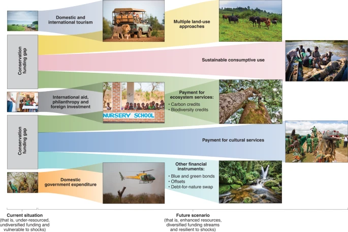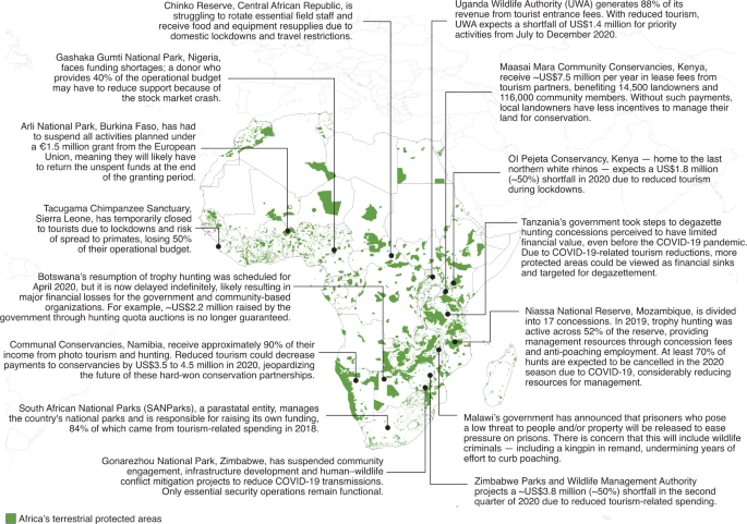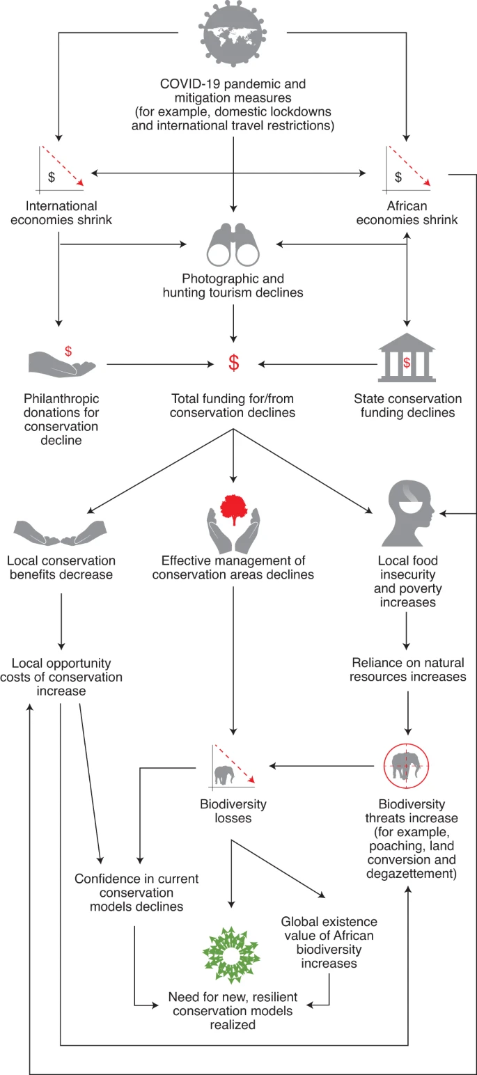 Our analysis led us to the realisation that the measures to control the spread of COVID-19 would result in significant gaps in financial support for conservation efforts across the continent. For example, one of the supposedly sustainable models of conservation was linking conservation efforts with income from tourism and eco-tourism. Now that source of income, both at the national and local scale, was gone. Likewise, government expenditure on conservation efforts was likely to be diverted to averting the potential socio-economic and health crisis that could unfold (Fig. 3 below).