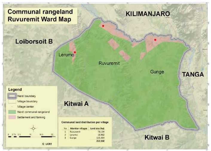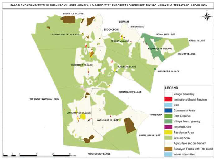 In this context, land tenure rights for pastoralists can play a critical role in securing communal grazing lands. On-going practices of NGOs working with villages across the Tarangire Ecosystem to secure rights to land and resources through spatial planning at the local scale is the first important step in this process. Careful, participatory planning processes can help rural people to decide on limits to cultivation, or to secure communal grazing lands through legal tools such as Certificate of Customary Right of Occupancy (CCROs). Local scale planning can then be scaled to up to joint-village plans (see Fig. 2) where planning can help to preserve larger swaths of rangeland. When these efforts at the local scale are repeated across large landscapes, a mosaic of land uses can help to conserve productive and resilient rangelands at the large landscape scale (see Fig. 3).